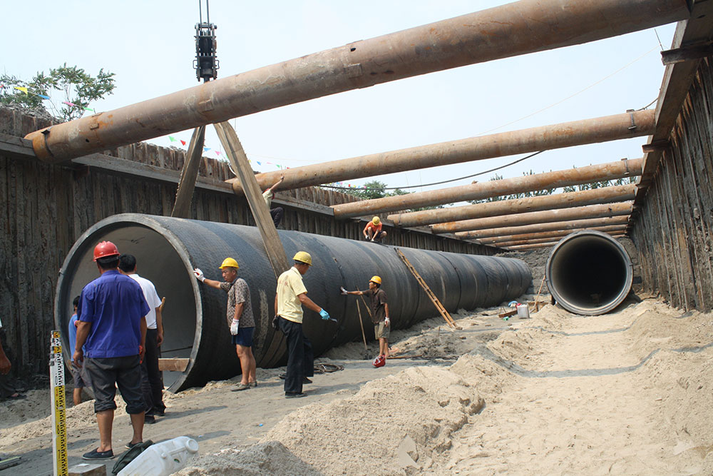 東郊污水處理廠(chǎng)是亞洲在建的半地下污水處理廠(chǎng),建成后污水處理能力為60萬(wàn)噸/天,再生水能力10萬(wàn)噸/天,承擔(dān)著城市污水凈化的使命。澤寶公司負(fù)責(zé)供貨的進(jìn)水、再生水管網(wǎng)項(xiàng)目是該工程的重要組成部分。該段頂管是本市乃至華北地區(qū)達(dá)到直徑4米的頂管項(xiàng)目,采用外徑4.8米內(nèi)徑4米混凝土套管內(nèi)穿直徑3米玻璃鋼夾砂管的形式穿越京津塘高速高架,穿越距離長(zhǎng)達(dá)131米。
