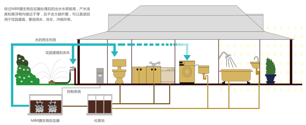 經(jīng)過MBR膜生物反應(yīng)器處理后的出水水質(zhì)極高,產(chǎn)水濁物和懸浮物均接近于零,且不含大腸桿菌,可以直接回用花園灌溉、景觀用水、洗車、沖廁所等。