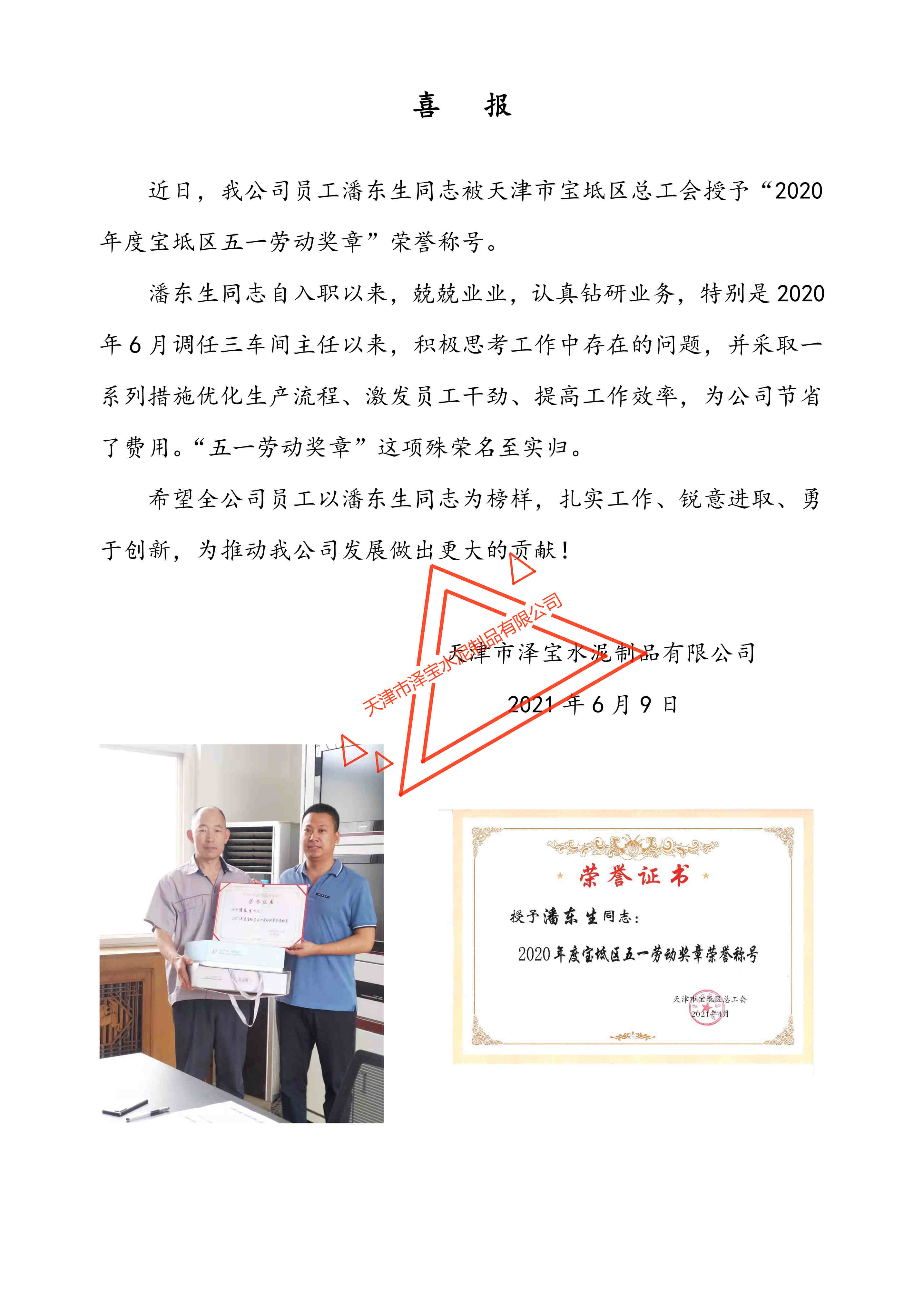 祝賀我公司員工被天津市寶坻區(qū)總工會(huì)授予“2020年度寶坻區(qū)五一勞動(dòng)獎(jiǎng)?wù)隆睒s譽(yù)稱號(hào)