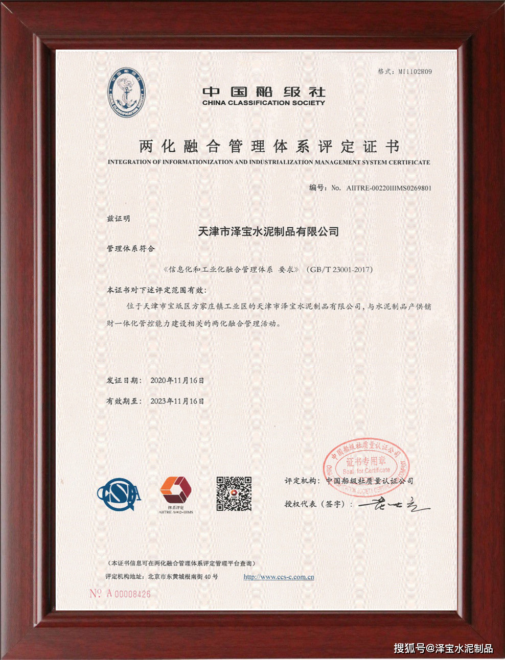 經(jīng)過近一年體系建設(shè)和運(yùn)行,我公司兩化融合管理體系順利通過專家組審核,于2020年11月16日獲得中國船級社頒發(fā)的“兩化融合管理體系評定證書”成為率先通過該體系評估審核的水泥制品研發(fā)制造企業(yè)。